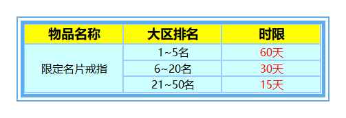 三、单大区前50名专属奖励 各大区竞技榜前五十名玩家都能获得专属排名奖励限定名片戒指!展示非凡的魅力~