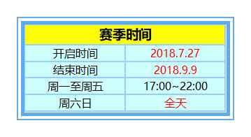 竞技场S6赛季 活动时间:7月27日-9月9日 活动地址:PC端竞技场 一、跨服竞技场S5赛季 2018.7.27-2018.9.9,S6新赛季激情进行!周一至周五的开放时间为17:00-22:00,周六周日全日开放哦!