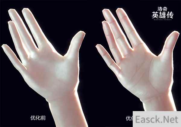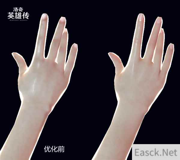 从对比图中可以看出,在原本手部模型的基础之上添加了关节与掌纹,皮肤光滑度与光效方面也进行了调整,使其更贴近于现实。