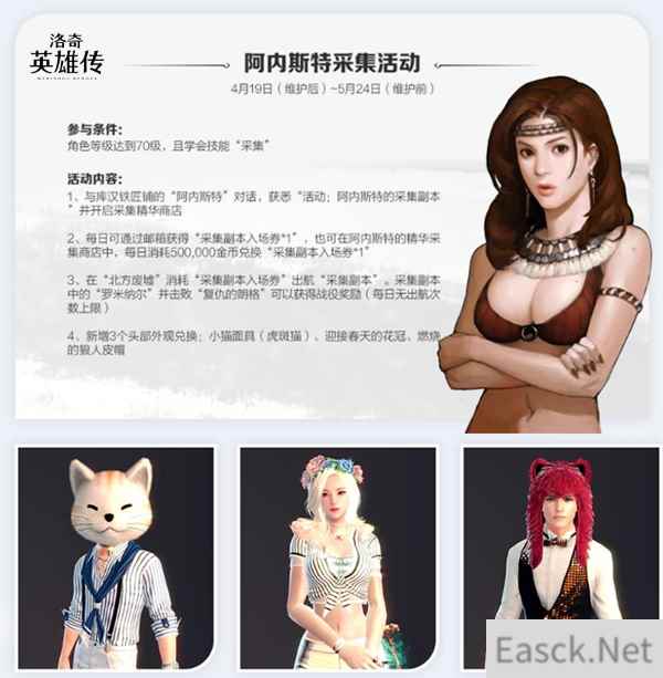 【福利活动】 在介绍了新品与外观后,就到了围观福利活动的时候啦!首先是大家熟悉的“阿内斯特采集活动”,达到70级且习得采集技能的角色,可以参与至其中,本次可是新增3款头部外观供英雄们兑换!