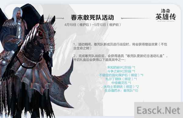 “特殊副本的大马士革钢铁活动”也会同步开启,完成特殊副本战役可从中获得“大马士革钢铁”(每周最多可获得9个)。 “春末敢死队活动”是在活动期间,敢死队新成员进行战役可获得增益效果(不包含生命之树),完成敢死队战役后还可获得活动礼盒!