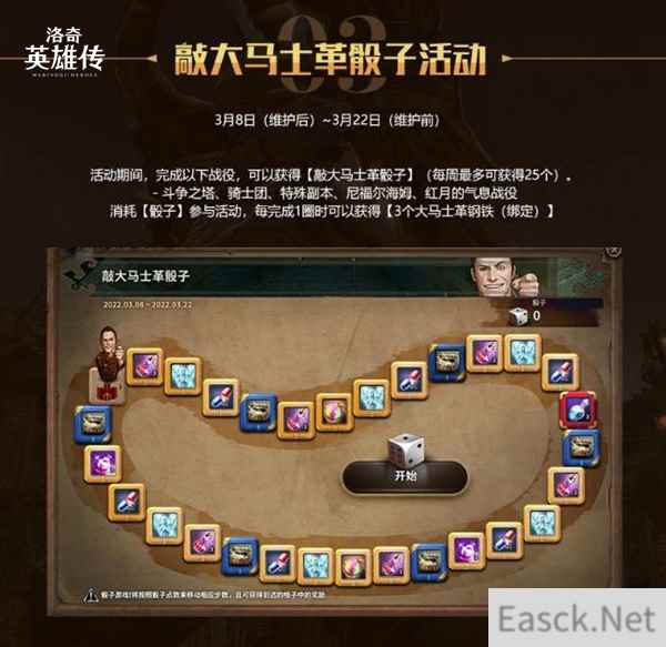最后,就是“敲大马士革骰子活动”,在活动期间,完成指定战役,可获得“敲大马士革骰子”(每周最多可获得25个),消耗骰子参与活动,每完成一圈时可获得“3个大马士革钢铁(绑定)”。