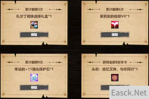 累计翻牌达到一定次数,可获得对应奖励,获得全部8张字卡,还可获得“头衔:拾忆艾琳,与你同行”哦!需要注意的是,头衔将于12月13日维护后开放领取,奖励领取有效期至12月25日,兑换码使用有效期至2023年1月15日23:59。