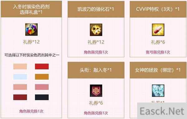 【入冬每日任务活动】 在11月29日维护后至12月13日维护前,每日完成全部每日任务,可获得入冬礼券,礼券可在兑换商店中兑换到入冬时装染色药剂选择礼盒、CVVIP特权(3天)以及头衔等道具哦!