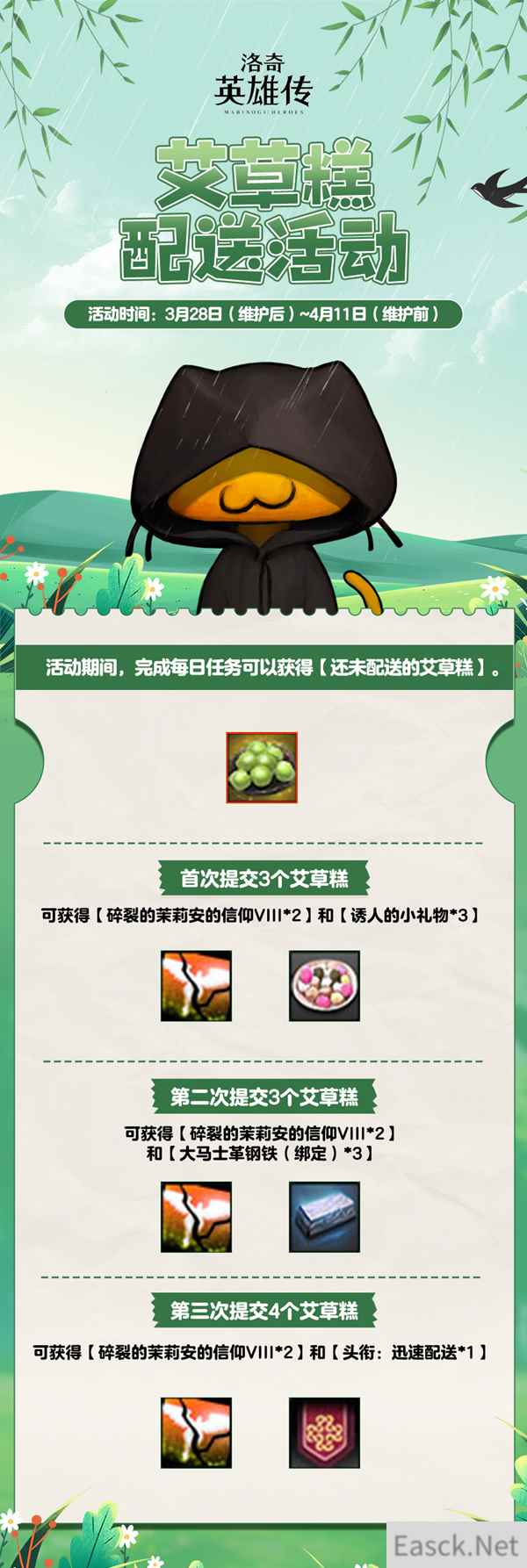 【艾草糕配送活动】 在3月28日维护后至4月11日维护前,英雄们完成每日任务可获得“还未配送的艾草糕”,提交艾草糕至对应次数与数量,还可获得“头衔:迅速配送”!