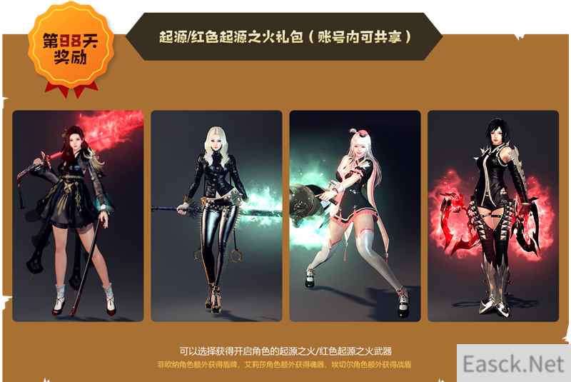 而签到至98天可获得的“起源/红色起源之火礼包”想必英雄们都不会陌生,冒着熊熊火焰的武器可谓威胁感加倍,英雄们可以根据自己的喜好选择蓝绿色火焰或是红色火焰的起源之火武器哦!除了获得武器外,菲欧纳角色将额外获得盾牌,艾莉莎角色将额外获得魂器,而埃切尔角色也将额外获得战盾。