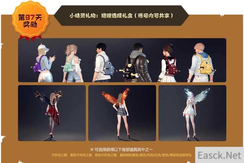 而当英雄们签到至97天时,将获得“小精灵礼物:翅膀选择礼盒”,其实其中可不仅仅包含帅气的翅膀,还有多色百搭的黛莉娅的双肩背包可供选择!