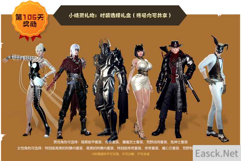 当英雄们签到至最后一天,也就是第105天时,就能获得咱们的“小精灵礼物:时装选择礼盒”啦!其中男性角色可从5套时尚时装之中选择1套获得,而女性角色则可从7套外观之中选择1套。值得一提的是,“暗黑板甲套装”与“特别版高贵的阿穆内套装”是此次加盟的全新外观,英雄们可千万不能错过啦!