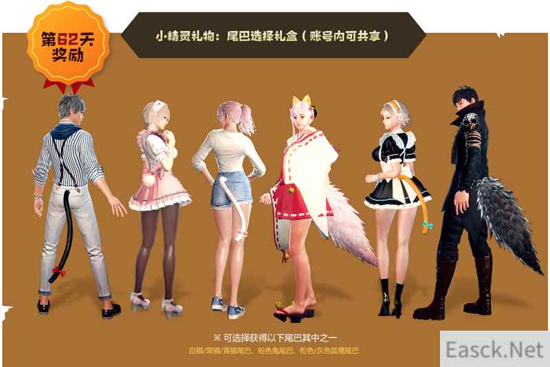 首先,就是英雄们参与活动至第62天时可获得的“小精灵礼物:尾巴选择礼盒”,其中共有6款颜色与形态不同的尾巴供英雄们挑选!无论是俏皮可爱的白/黑/黄猫尾巴,还是小巧的粉色兔尾巴,亦或是巨大柔软的粉色/灰色狐狸尾巴,总有一款戳中你的萌点!