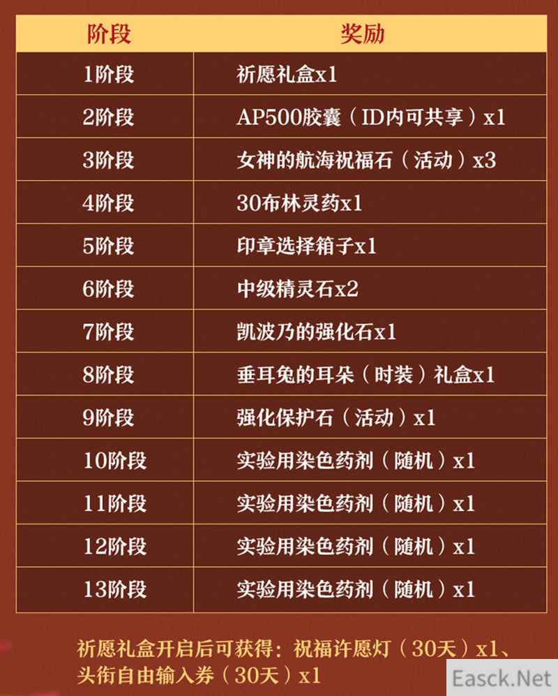 在这些奖励中,除了AP胶囊、中级精灵石、强化保护石、实验用染色药剂(随机)等实用道具外,还有内含祝福许愿灯(30天)和头衔自由输入券(30天)的“祈愿礼盒”,可可爱爱的“垂耳兔的耳朵(时装)礼盒”哦!