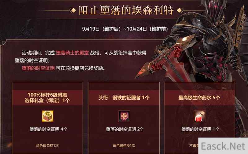 【福利活动】 当然,在全新时空扭曲战役“堕落骑士的殿堂”上线的同时,还会有与之相关的福利活动哦!在活动期间,完成“堕落骑士的殿堂”战役,可从战役掉落中获得堕落的时空证明,这些证明可在兑换商店兑换到头衔等道具!