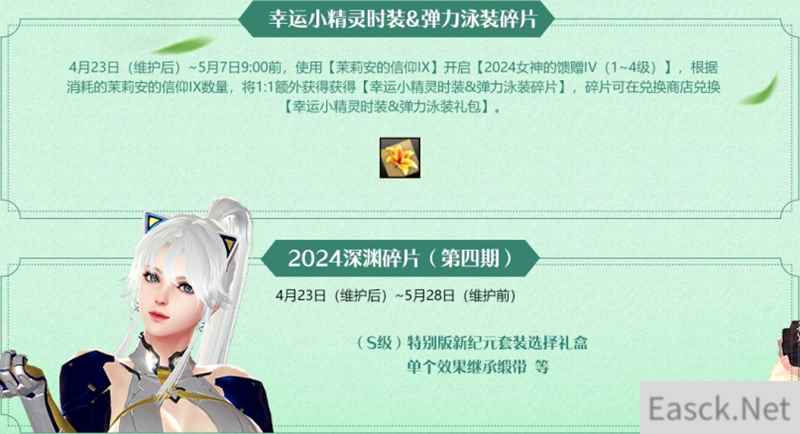在4月23日维护后至5月7日9:00前,使用“茉莉安的信仰IX”开启“2024女神的馈赠IV(1~4级)”,根据消耗的“茉莉安的信仰IX”数量1:1额外获得指定碎片,碎片可在兑换商店兑换到“幸运小精灵时装&弹力泳装礼包”。同时呢,英雄们还可使用2024深渊碎片(第四期),在碎片商店兑换到S级“特别版新纪元套装选择礼盒”等时装和道具。