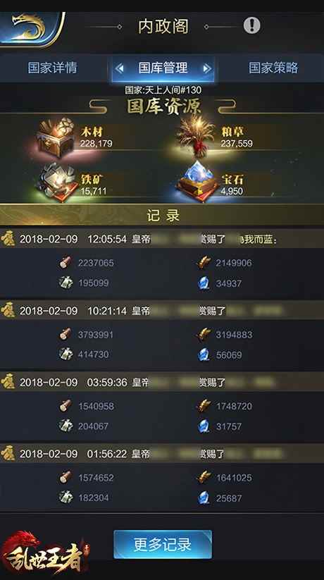 国库管理 内政阁新 国库可以自动增加资源,当本服玩家采集时,自动复制一定比例进入国库,玩家获取的资源不会减少。皇帝可以将资源分配给本服的任意玩家,每名玩家每天获取会有上限。皇帝每次给予玩家资源,都会在国库中被记录下来,资源包括木材、粮食、铁矿、宝石。