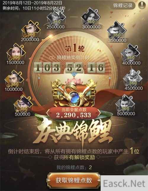 全服玩家一起积攒点数解锁锦鲤大奖,全服锦鲤点数达到一定进度可解锁更多锦鲤奖励,周年锦鲤奖励的丰富程度,可以说离不开全体玩家的努力! 当锦鲤抽奖倒计时结束时,将在全服随机产生一位锦鲤获得已解锁的全部锦鲤奖励!偷偷告诉大家,个人点数占全服点数的比重越高,成为锦鲤的概率越大,因此只要多参与周年庆活动,说不定下一条锦鲤就是你哦!
