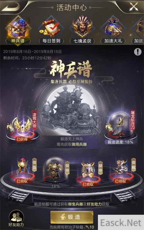 五、神兵谱:集神兵,赢装扮 玩家可通过神兵谱活动中的各种活跃任务增加各兵器的获取进度,通过活跃任务及关系链好友助力还可获得欧治子秘籍后,可用于“锻造神兵” 。当玩家集齐全部神兵后,可获取终极大奖——专属皇城装扮,让你的皇城成为乱世中的焦点!