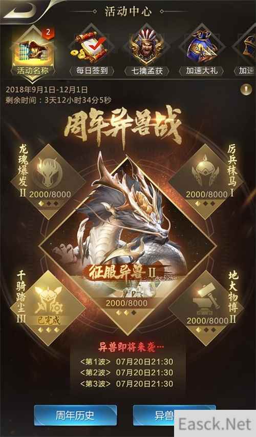 二、周年列传:打异兽分奖励 各位玩家可以在活动中心参与周年异兽战,大家需要分别完成练兵、采集、打野、战争以及征服异兽任务,解锁周年历史,值得一提的是,不同的排名成绩会获得相对应的神秘奖励!