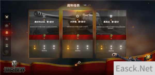【庆典任务奖励丰厚】 在周年庆典期间,您还可以通过驾驶任意4级至10级坦克参与标准模式战斗(包括战役模式)来完成周年任务,并可以通过车库右下角的窗口访问周年庆活动页面,并查看您的完成进展。 指挥官们可体验三种周年任务类型,要求您达成的目标分别为获得一定数量的基础经验、摧毁一定数量的敌方坦克和获得的经验排在队伍前7名之内。三种类型的周年任务分别组成三条任务链,每完成一个任务,同类型的下个任务目标就会解锁。