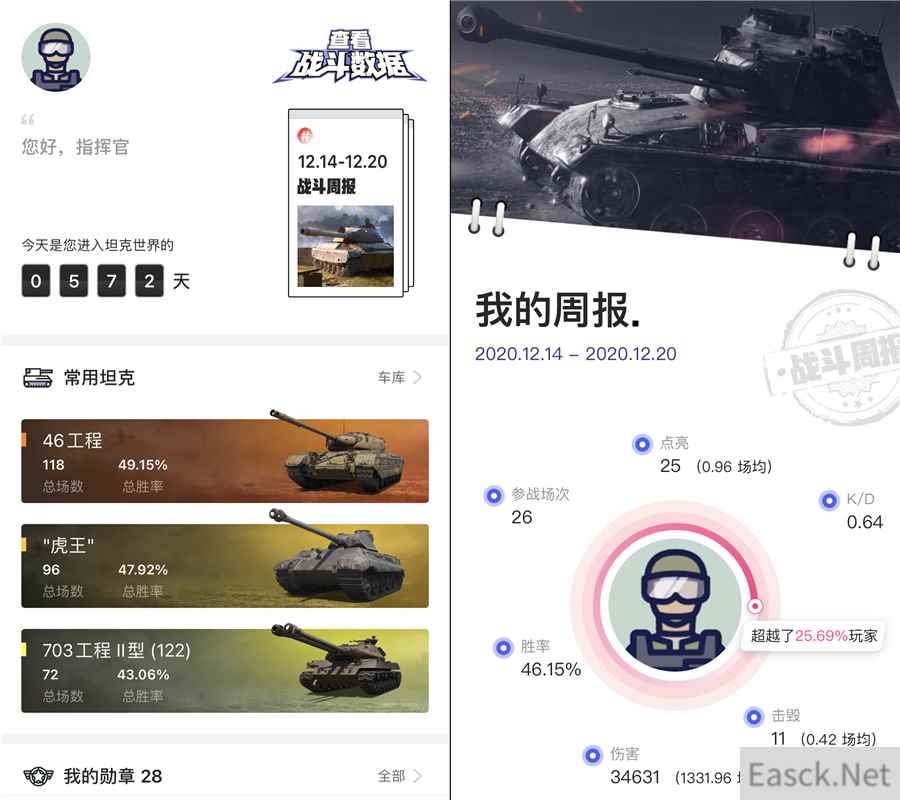 而跟随【我的】分页,你将浏览自己的生涯经历与游戏偏好,这里不仅能查看战斗周报,常用坦克、勋章等个性数据,更可通过战斗数据与战友们一较高下,并能发现自身不足,以便调整你的战术。
