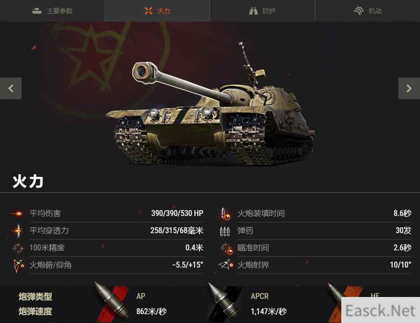 比起躲在后方灌木丛里远程狙击,K-91-PT更适合抬起那122毫米的火炮,在中短距离直面交锋。这门主炮基础精度为0.4,AP弹和APCR弹的单发伤害可达390点,前者的平均穿深为258毫米,而后者可达315毫米。通过选装合适的配件、乘员技能和特长、给养和指令,还可以将火炮的装填时间降低至6秒,较快的进攻节奏配上强有力的火炮,使你在面对重坦时也能游刃有余。