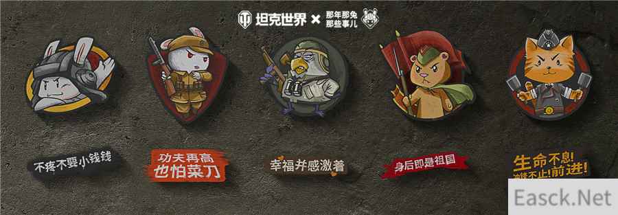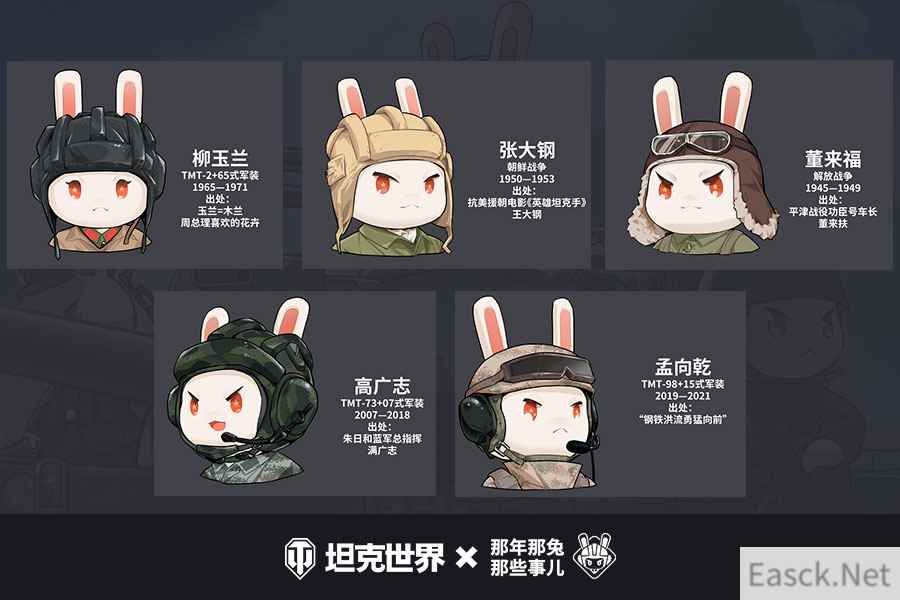 如果了解国漫《那年那兔那些事儿》中的那些经典名场面,那就一定会对兔子们勤劳勇敢、个性鲜明的特质有深刻印象。这次,萌兔们派出了五名英雄代表来到《坦克世界》的前线营地,等待被您征召并会犒赏完成挑战的玩家。他们分别是车长高广志、炮手柳玉兰、驾驶员孟向乾、通信兵董来福和装填手张大钢。
