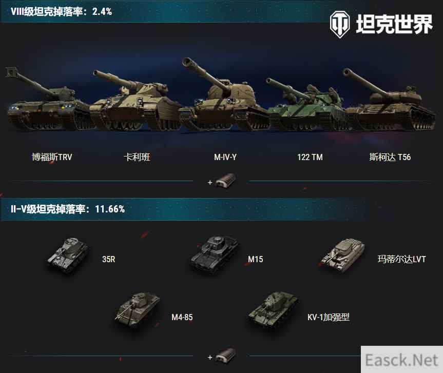 这次的奖励中包含了三辆全新的8级坦克,他们分别是V系重坦博福斯TRV、Y系重坦卡利班与M系重坦M-IV-Y,并且总计能获得11款独特的3D风格。