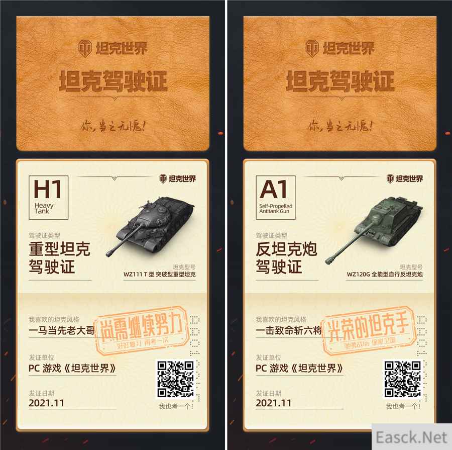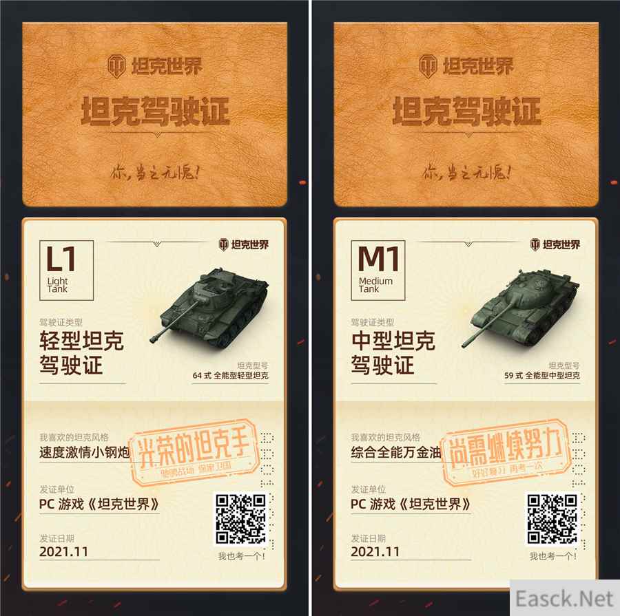 【趣味问答 赢专属坦克驾照】 开坦克也能持证上岗?想要满满的仪式感这就帮您安排!战场上的每一次碰撞与交火,都见证了车长们的战斗生涯,而每一位合格的硬汉,都应该拥有一本属于自己的坦克驾照!现在访问活动专题页,在答题页面通过四个科目的问答测试,我们将根据您每一个问题的选项进行综合评定。 每个科目答完全部问题,即可解锁下一环节的测试,成功闯关后将根据答对数量给予“光荣的坦克手”或“尚需继续努力”两种评级,从而领取您的专属定制款驾照。