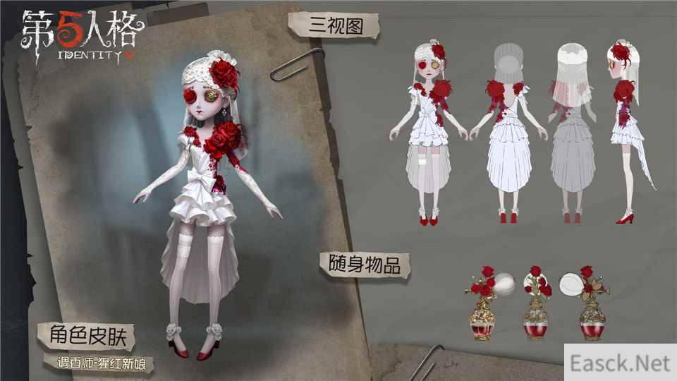 猩红新娘,亮相推理之径 第九赛季开启后,玩家的第八赛季推理之径等级将被重置,四面骰子最多只能保存100个,在重新启航探索推理之径的过程中,调香师奇珍时装“猩红新娘”领衔丰厚奖励等待着你的解锁。 猩红新娘的整体造型是一款繁复的婚纱,长长的后裙摆,大量的玫瑰花装饰,精美的透明蕾丝镂空手套都在诉说着即将步入婚姻殿堂的喜悦。但猩红新娘头部、右眼和上半身的玫瑰花都被染成了鲜艳的红色,与纯白色的婚纱形成了强烈对比,不规则的晕染痕迹则表明这或许源自突如其来的变故。猩红新娘随身携带着一瓶香水,华丽的香水瓶里,鲜红的香水似乎散发着让人无法自拔的芬芳。
