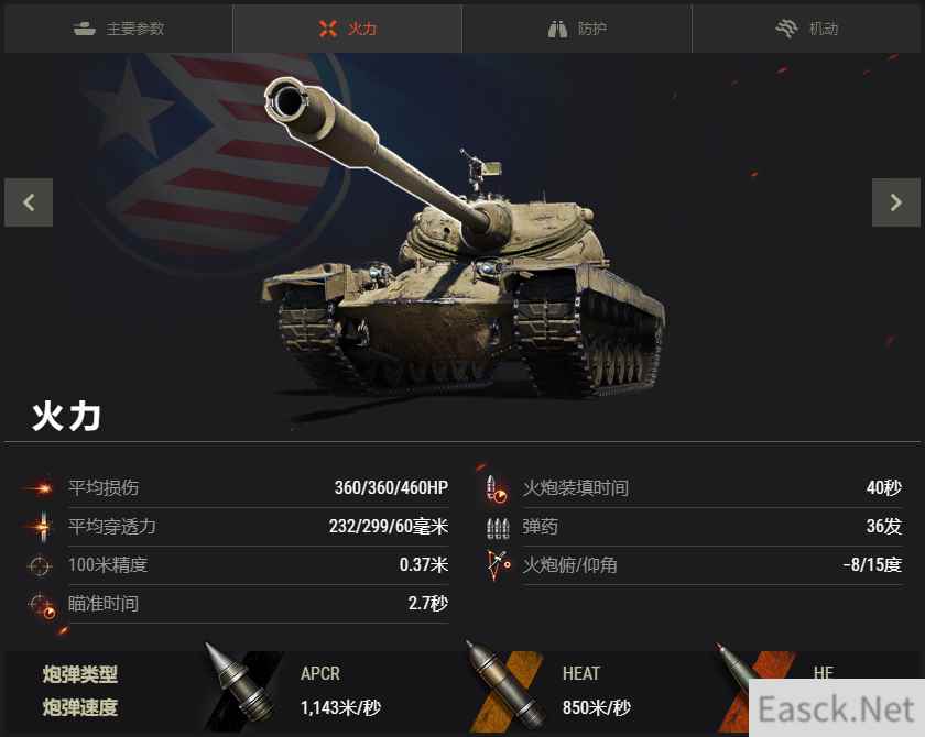 这辆来自M系的重坦堪比一名头戴牛仔帽、手握左轮的精明猎手,其善于隐藏在掩体之后,并密切关注着敌人的一举一动,当猎物冒进时,其将抓准时机射出一连串的子弹给予对手致命打击。 T77安装了一门120毫米的弹夹装填火炮,弹夹内能够储存3发炮弹且炮弹的装填间隔为2秒;其平均单发损伤便达到360点,而利用弹夹装填后,更可在4秒内打出1080点损伤;并且T77可对敌方坦克的模块造成更多损伤、更频繁地造成起火与弹药架爆炸,让您短时间内便可重创敌人!