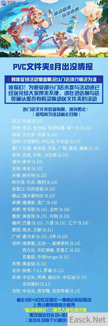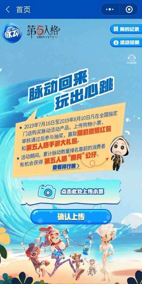 《第五人格》与脉动携手,在全国23个城市海量便利店开展回馈活动,活动期间,在指定便利店购买两瓶脉动,就能获赠第五人格PVC文件夹一个,既能畅享清凉的夏日补给,又能领取精美的游戏周边,玩家们纷纷奔赴各指定便利店抢购,高涨的热情令许多便利店的文件夹迅速告罄!截止8月31日,还有部分便利店活动尚未结束,请抓紧时间抢购,满饮一口,继续你的庄园竞技! 上传小票,赢取奖励 《第五人格》还联合“脉动福利社”在7月16日至8月10日期间举行了上传小票兑好礼的活动,消费者在全国任意便利店购买脉动后,上传小票至“脉动福利社”小程序-第五人格专属页面,就可100%获得第五人格游戏内脉动礼包和随机微信红包,部分累计脉动数量排名前列的消费者还获得了第五人格“佣兵”公仔!