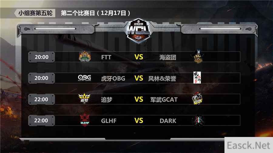 而无论如何,以“团战不朽,我即最强”之名进行终极角逐的八只战队,均将全力以赴,就让这些拥有不灭团魂与制胜谋略的逐梦选手,一起煮酒论英雄、点燃年末的竞技火花吧! 本周的小组赛依然采用单循环积分赛制,今日(12月17日)的前两场比赛分别是“FTT”对阵“海盗团”和“虎牙OBG”对阵“风林&荣耀”,两场比赛将于20点同时进行,在瞬息万变的战场上究竟谁能顶住压力,上演迅猛的乘胜追击或华丽的逆风翻盘,就让我们拭目以待吧!