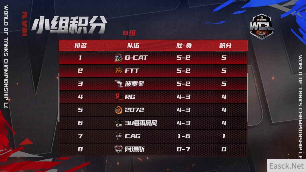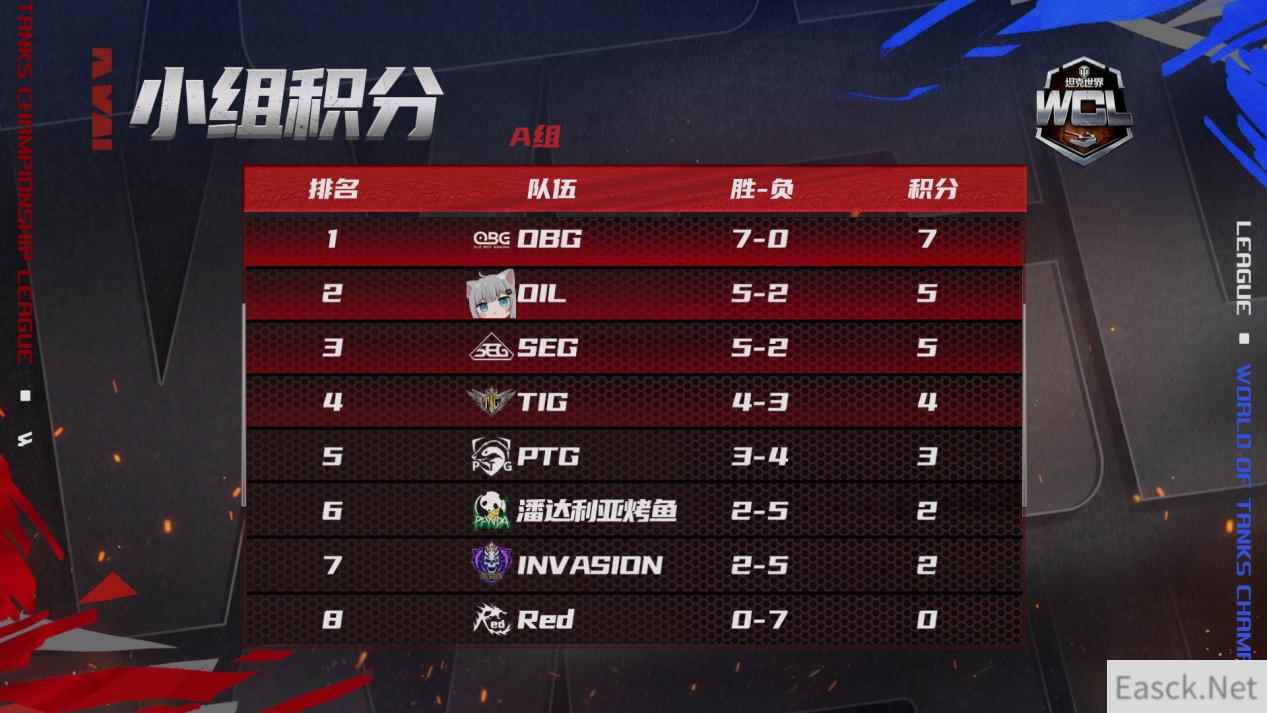 随着TIG击败PTG拿到最后一张淘汰赛入场券,WCL小组赛阶段比赛已经全部结束。八支战队通过精彩的表现杀出重围,进入到淘汰赛阶段。他们分别是: A组:OBG、OIL、SEG、TIG