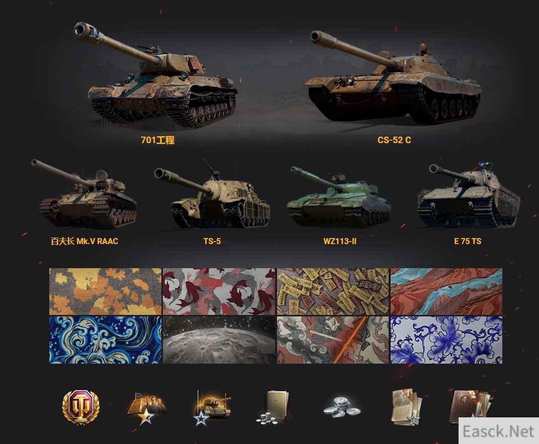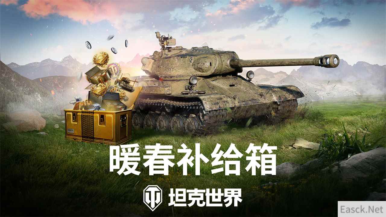 除了701工程以外,开启暖春补给箱还有机会获得其他5辆金币坦克: ·装甲和机动性兼备的 WZ113-II ·来无影去无踪且具有燃气轮机机制的 CS-52 C ·装甲坚固、穿透力强、射速高的 TS-5 ·车体正面装备间隙装甲,且火炮俯角优秀的百夫长 Mk.V RAAC ·简单可靠的全能重型坦克E 75 TS 开启暖春补给箱,将有机会获得: ·以上6辆金币坦克之一 (1.3%掉落几率) · 8款稀有2D风格之一,为您的新坦克换上春装 (15%掉落几率) ·下列资源之一: 个人储备或银币(50%掉落几率) ·下列资源之一: 乘员手册、《坦克世界》高级账号天数或个人储备(100%掉落几率)