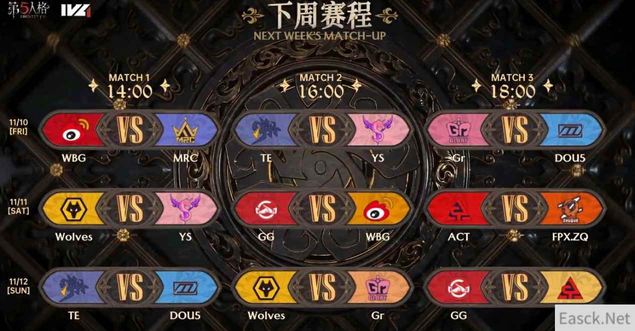 图为蜘蛛闪现震慑古董商 本周对局同样精彩的瞬间有:第一天TE vs WBG 第一局上半场WBG_Alex回身躲枪不断自己的追击节奏;第二天MRC vs Gr 第二局上半场Gr_heart在监管者已知自己位置的情况下,远距离空地拉球成功撞救杂技演员;在第三局上半场Gr_SuperRich爱哭鬼怨灵缠身精准命中求生者,MRC_Nanako云门预判闪现;第三天 WBG vs成都GG 第三局上半场 GG_18超长通道飞轮抵消延迟伤害;FPX.ZQ vs ACT 第一局下半场ACT_xen与监管者心理博弈,自起后反心理前往大门点门骗掉歌剧演员传送,配合古董商ACT_Maom的牵制极限跳地窖,在第一局为队伍争取到平局。 【赛况总结】 赛程过半,各个战队步入逐渐稳定的状态,同时也派新人上场练兵,为后半程的比赛做足准备。总体看来,MRC战队求生者阵营依然十分有韧性,监管者MRC_XC也一改低迷状态,在比赛中及时调整思路,取得了本赛季的第一个MVP;新人Wolves_Eleven救人稳中带秀,牵制博弈思路清晰,在加入成都Wolves后产生了良好的化学反应,逐渐向大家证明了自己;TE战队新人TE_ppei有魄力有胆量,每一步决策都是深思熟虑后的结果,果断又自信,心理抗压能力极强,期待他以后更加亮眼的发挥;FPX.ZQ战队求生者阵营相较上周稳定了很多,运营也井然有序;而WBG前期牵制过于依赖辅助位的帮助,导致整体密码机进度较慢,一旦一溜出问题,后续节奏均会被打乱的问题依然存在,如果能及时调整运营思路,相信WBG的排名能更上一层楼。 【赛事预告】