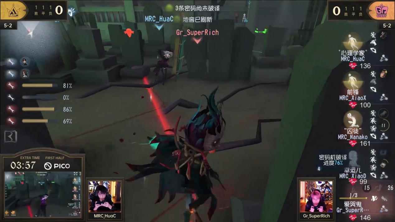 图为空军飞轮预判歌剧演员闪现 第二天MRC vs Gr 加时赛上半场,Gr_SuperRich怨灵缠绕节节逼进求生无处可避,MRC极限拉扯起死回生力保平局:开局1分14秒Gr_SuperRich击倒囚徒,场上密码机约两台,虽然监管者技能未交,但本局场上有两个化险为夷,从阵容和天赋上看,还是可以保护囚徒尽量营造一个四人开门战。但前锋露面过早,被爱哭鬼逼救,待囚徒二挂后场上密码机进度并未有太大进展,此时求生者阵营稍显劣势。爱哭鬼怨灵瞬发,十分精准地拦截到拉球前去营救的前锋。救下囚徒后,前锋想要拉球补撞爱哭鬼帮助囚徒转点,但Gr_SuperRich更技高一筹,灵活走位躲掉MRC_XiaoX的拉球补撞。前锋只好从外帮忙在爱哭鬼必经之路上卡位,介于爱哭鬼的强追击能力,Gr_SuperRich见招拆招,将前锋击倒后挂上继续追击囚徒,尽管有很大的身位,有高矮参差的建筑物遮掩,Gr_SuperRich依然靠着灵敏的嗅觉迅速发现囚徒动向紧随其后。心理学家接力保护囚徒的任务,爱哭鬼先拉火命中心理学家,再出刀击倒囚徒,最后极限鬼火拉中心理学家,双人倒地,行云流水一气呵成,挂飞囚徒后直接挂上心理学家衔接第二手节奏,此时大遗产和半状态前锋都被压迫在墓地里,监管者果断切失常,胜利的天平不断地向Gr倾斜,爱哭鬼在墓地密码机,淘汰进度已经过半的心理学家,前来救援的MRC_XiaoD之间来回拉扯,胜利只是时间问题。此时,MRC的韧性展现出来了,为避免拉扯久了己方不但人没救下来,失常好了让本就不富裕的密码机进度雪上加霜,MRC_XiaoX以身为饵,引诱爱哭鬼来将自己击倒以留出机会让辛运儿将心理学家救下去破译新的密码机。在救援前锋的过程中,幸运儿虽中了怨灵但躲过了实体刀,赶在淘汰进度最后一点将前锋救下,并为其抗刀上挂。此时外围的密码机进度已经来到了80%,前锋在半血的状态,需要尽力拉近和椅子之间的距离,还要躲掉高速旋转的怨灵避免被压起身,但是MRC_XiaoX做到了,在被击倒的一瞬间回光返照触发,救下幸运儿后倒地位置尽可能远离墓地大门,求生者共同努力,为队伍争取了一个平局。虽最后结果MRC落败,但这其中人屠之间的较量拉扯,不失为是一场精彩的对局。