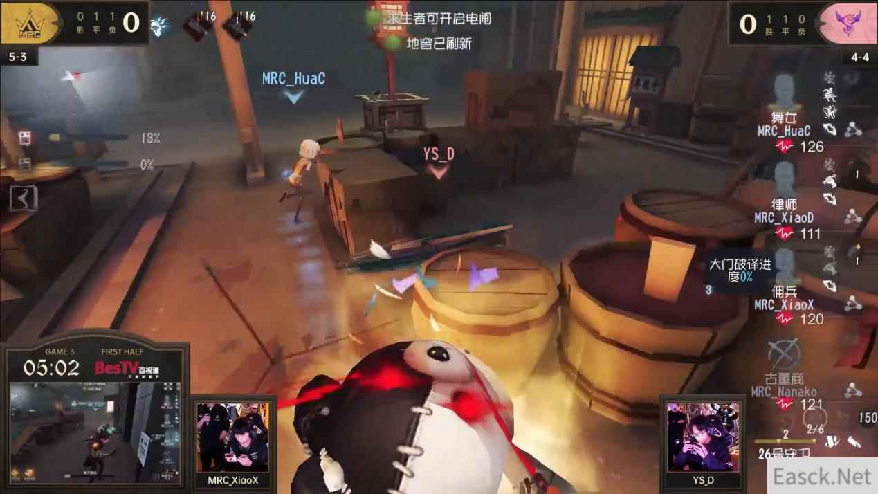 图为开门战舞女预判邦邦闪现 在同一场比赛的下半场,MRC_XC前期快速击杀势如破竹,中期虽节奏断条但而后睡狮猛醒拿下四抓:破轮开局快速给杂技演员上两层刺,精准钉板封路,仅用49秒便击倒杂技演员。大副前来救援两次,但也仅是尽可能拖修机时间,没有多余的操作空间。挂飞杂技演员后,此时场上加起来仅剩不到一台密码机未破译,对于求生者来说尽管前期节奏不好,但目前情况还有可以运营的余地。舞女在牵制的时候尽力带离独栋遗产,MRC_XC预判华美舞步位置使用钉板夹中舞女将其击倒上挂,但因为MRC_XC想去干扰大副破译,排点错误,让心理学家无伤救下舞女并补好状态,此时大副密码机也已经完成破译。MRC_XC只好及时改变思路围绕三连机开始控场,击倒心理学家后追击大副,消耗道具和状态,并切技能将中场遗产机失常,不断拉扯,随着状态的下降和绝处逢生的减少,求生已经是陷入慢性死亡的状态,最终破轮四抓,终结比赛。
