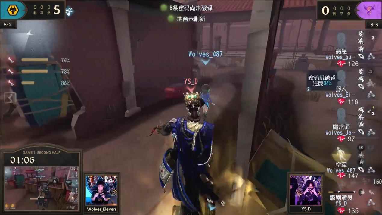 图为监管者切巡视者技能精准找到杂技演员 第一天YS vs 成都Wolves 第一局下半场求生者布局明确避免三连奠定优势,空军飞轮躲闪野人博弈拉满收获平局:开局YS_D追击Wolves_487的空军,空军求稳直接交枪,在终点站双板区博弈下板后,Wolves_487预判歌剧演员闪现,飞轮顶掉一刀后衔接翻窗加速继续牵制,倒地时场上已经有两台半将近三台的密码机进度。魔术师将空军救下后,空军为不干扰三站下的大遗产,选择向狮子笼角落拉点,当歌剧演员压迫到三站干扰魔术师病患的时候,Wolves_Eleven趁机从马戏团后方绕到椅子面前救下空军。空军飞轮进板抵掉一刀,板前互相博弈,最终YS_D回溯将空军击倒。Wolves_487不负众望,这次牵制成功将三站下密码机进度拖了出来,避免自己搏命状态被击中后监管者去三站下干扰队友破译,进一步避免了监管者以此密码机为中心展开控场。淘汰空军后,YS_D选择去追击正在大房里修机的魔术师,Wolves_Jelly的优秀牵制拖出了让野人和病患两人新开一半密码机的时间。歌剧演员放弃继续和满状态魔术师周旋,传送终点站守机子,落地直接追击半状态的野人。野人骑猪逐渐拉离终点站,在野性伙伴半状态时,选择直接冲刺进板,因为若此时再吃一刀,野人则无法进入人板区博弈从而快速倒地,会造成密码机进度不够、监管者可以通过守椅子来拖传送CD的情况,将会对求生者是非常大的威胁。Wolves_Eleven也抗住压力,砸中监管者、板前博弈、回溯翻板,连续两次躲掉了歌剧演员的进攻,也成功将密码机拖至压好。在高熟练度的歌剧演员面前,成都Wolves的求生者通过精巧的博弈和运营在第一局中拿到了一个宝贵的平局,为后面的胜利奠定基础。