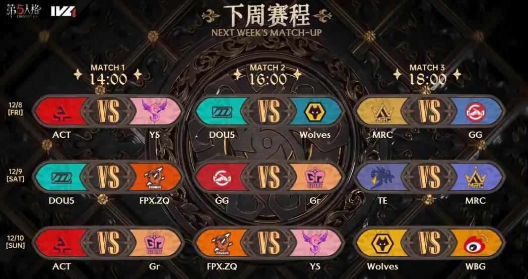 图为记录员利用记录蓄力刀骗取求生延迟救人 【赛况总结】 下半轮比赛第四周,WBG战队求生者状态极佳,向我们展现出岁月沉淀后的配合与实力,FPX.ZQ_DongX在逆境时总能抓住机会利用细节战胜对方;成都Wolves求生者还需继续磨合,监管者在绝对劣势前依旧保持着稳定心态与一定统治力;成都GG新人在比赛对局中展现风采,为团队贡献自己的力量;MRC战队监管者终于拨开迷雾证明自己,求生者面对失利不气馁的精神正是每个队伍最需要的;DOU5战队求生者敢打敢拼,希望在接下来的比赛中能保持状态,带来更多精彩的对局。 【赛事预告】