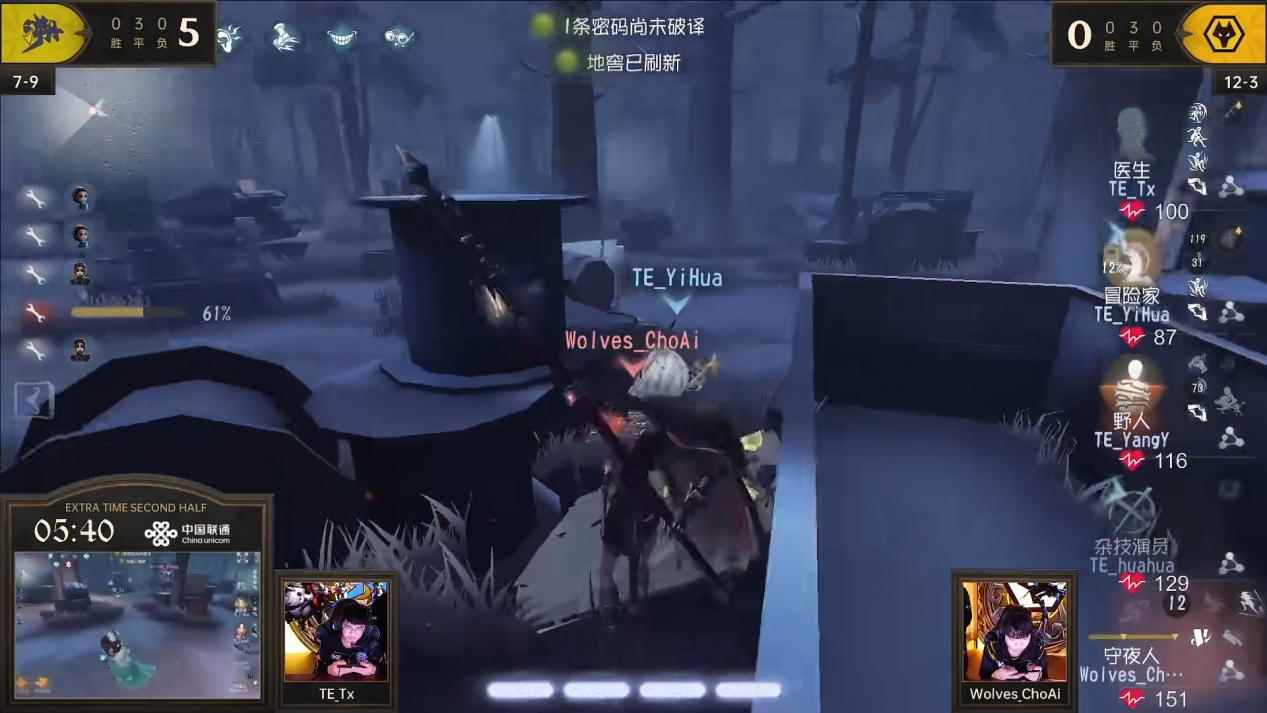 图为律师弹护腕成功躲开红夫人投镜 第二天 成都Wolves vs TE 加赛局下半局,在成都Wolves求生者被四抓近乎不可能翻盘的情况下,Wolves_ChoAi稳住心态以更短的时间四抓翻盘赢得最终胜利:开局Wolves_ChoAi使用守夜人直奔冒险家,但在野人嚎叫的掩护下,冒险家早已离开出生点,在长时间的寻找后,Wolves_ChoAi转头追击杂技演员,经过一段时间的周旋后,在两板一窗处利用风行不断翻窗逼迫杂技演员不停翻板,最终抓住机会闪现恐惧震慑满状态杂技演员。野人前来救人,守夜人中途拦截利用弱风吸住野人成功让上椅杂技演员进度过半,给野人一刀后逼迫其过半秒救,随后针对杂技演员使用风行加速击倒杂技演员并挂椅淘汰。求生者除野人外都隐蔽起来,Wolves_ChoAi守夜人转换思路跟着骑猪野人,等到下猪时给到一刀并板区博弈成功击倒野人并挂椅。接着Wolves_ChoAi守夜人前往最后一台密码机找到缩小冒险家给到一刀,随后利用蓄力刀骗出冒险家飞轮击倒挂椅,此时医生已救下野人并摸好。野人前来救人,守夜人给到其一刀后,在密码机压好前击倒野人并淘汰。密码机亮起,守夜人追向医生再次利用蓄力刀骗出医生飞轮并击倒挂椅,接着果断底牌切传送击倒正在点门的冒险家,以更短的时间完成四抓翻盘赢得胜利。