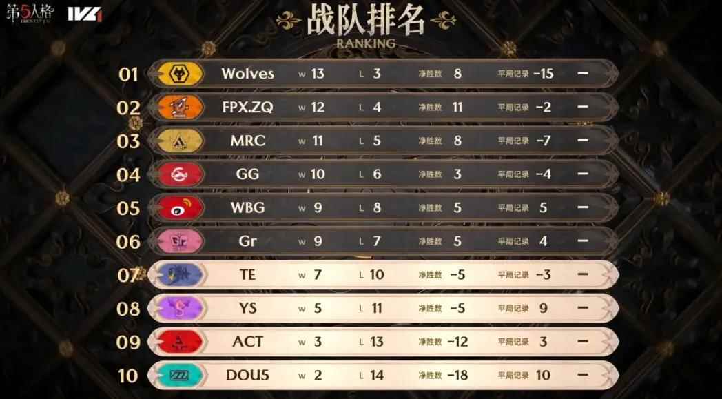 目前,成都Wolves以13场胜局依旧位列第一,FPX.ZQ以12场胜局位列第二,MRC、成都GG分别以11场胜局和10场胜局紧随其后, WBG、GR以9场胜局排名居中,而TE、YS、ACT、DOU5暂列后位。 【精彩回顾】 第一天 DOU5 vs MRC 第二局下半局赛点局,DOU5求生者相互配合默契,在上半局我方监管者被四出的劣势下,反手还了四出扳平比分:开局梦之女巫找到慈善家并寄生起追,DOU5_NAN慈善家面对两个信徒的追击在大空地利用手电筒陆续多次照晕信徒成功无伤转点至墓地,梦之女巫转而找到牛仔,通过本体放出巡视者咬住牛仔成功给到一刀,然而在DOU5_silverzhi勘探员的ob下被迫追击勘探员给到一刀,并用信徒的巡视者咬住勘探员成功击倒,不料在信徒牵往地下室路上被DOU5_Chen牛仔偷偷勾走。梦之女巫本体再次放出巡视者咬住牛仔并击倒继续信徒搬运挂至地下室,佣兵前来吃一刀救下牛仔并弹护腕突破包围,牛仔则利用飞轮和套索无伤转至板区,慈善家前来辅助并帮助牛仔扛到信徒闪现一刀,两人相互配合周旋信徒,梦之女巫转而追击半血勘探员并击倒继续挂往地下室,在地下室入口处勘探员挣扎下,DOU5_YuY佣兵前来扛刀。开门战时,勘探员与佣兵利用信徒落地刀僵直与回光返照加速成功与信徒拉开距离,梦之女巫操控信徒针对勘探员追击,在求生者勘探员磁铁弹开信徒、牛仔套中勘探员、佣兵再次扛到闪现一刀的配合下,DOU5求生者四人门口逃脱完成四出扳平比分。