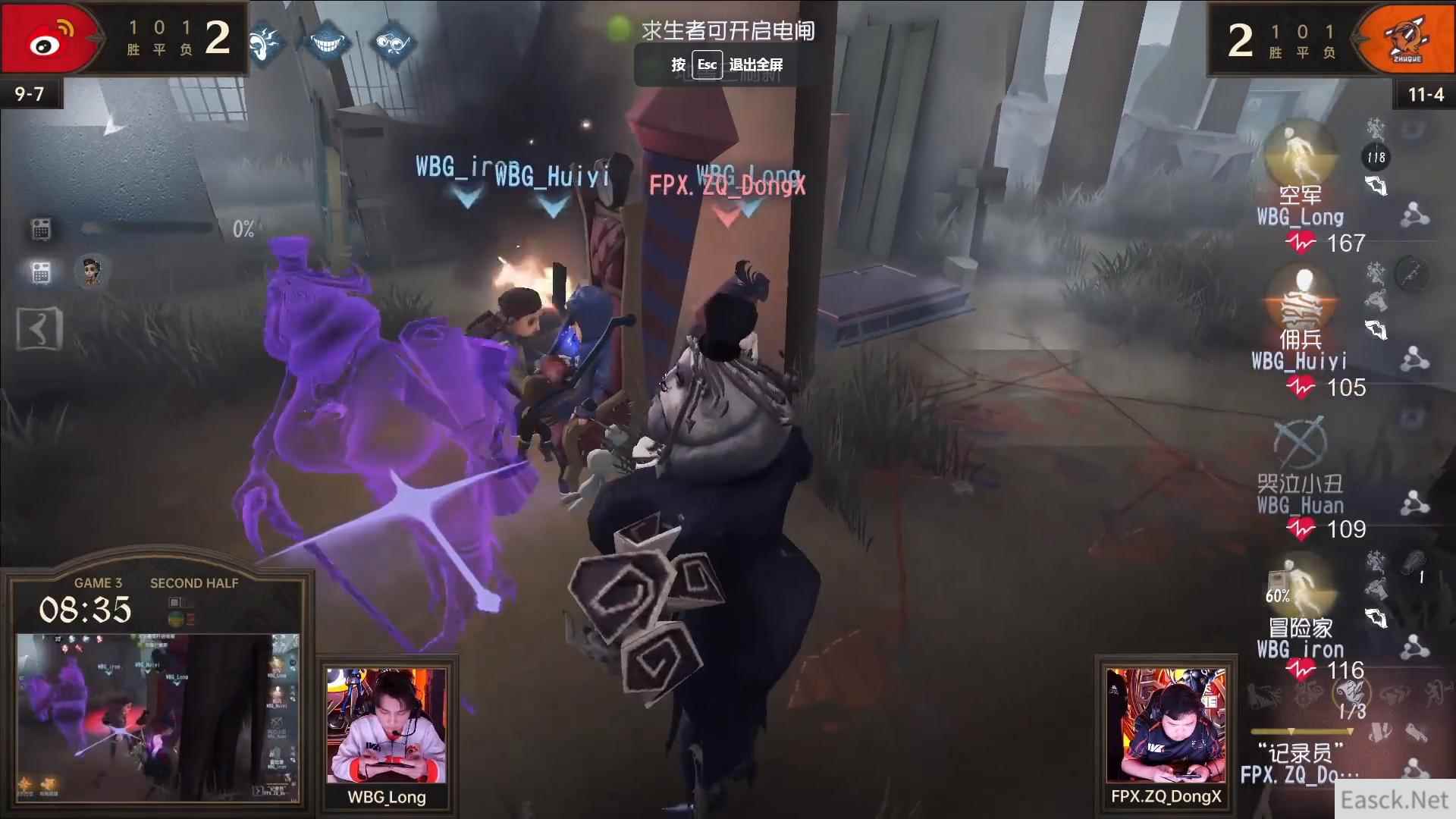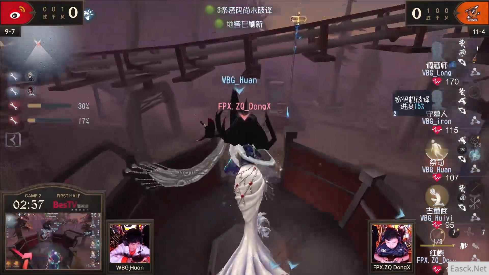 图为守夜人蓄力刀骗出冒险家飞轮并击倒 第三天 WBG vs FPX.ZQ 第二局上半局,WBG求生者多次配合拉扯,步步为营三出红蝶:开局红蝶起追守墓人,WBG_iron守墓人立即遁地,红蝶将其打出后接着飞近守墓人给到一刀,守墓人进祭司大洞,并在两个队友的治疗下于红蝶赶来时回满状态。红蝶转而追击祭司,祭司打洞,红蝶使用兴奋跟随钻洞给到一刀,WBG_Huiyi古董商前来辅助,但依旧被红蝶针对击倒。红蝶将祭司挂椅后,古董商前来吃一刀后救下祭司并继续辅助,周旋一会后成功古董商扛刀倒地,WBG_Long调酒师前来给祭司酒,在祭司飞轮挡刀和调酒师卡位的帮助下祭司成功回满状态,但调酒师接连被给到两刀倒地并被挂椅。守墓人前来吃一刀后救下调酒师,红蝶针对守墓人给到第二刀后果断底牌切传送至古董商并将其击倒。红蝶将古董商挂椅后直接出去追击调酒师并击倒挂椅,此时古董商已被救下,红蝶继续出去追击守墓人,无果后回来追击被救下的调酒师但被祭司扛到刀。红蝶立即传送至守墓人并快速击倒挂在最后一台密码机旁,WBG_Huan祭司吃一刀救下守墓人,守墓人接着被再次击倒并被挂至门口附近椅子,密码机已压好。红蝶前往最后一台密码机,调酒师趁机救下守墓人,古董商亮机,红蝶将大洞打掉后快速击倒古董商并传送至起点门,调酒师飞轮躲掉红蝶关键一刀为队友自愈前往门口争取到时间,最终求生者成功三出。
