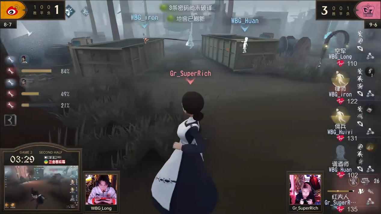 图为佣兵扛到信徒闪现一刀成功四出 第二天 Gr vs WBG 第二局下半局,WBG求生者利用道具互换,逆风翻盘三出红夫人:开局红夫人直奔WBG_Long空军方向,但空军静步走与佣兵干扰耳鸣配合成功迷惑红夫人,红夫人等待淬火朝WBG_iron律师投水镜并换位,追击一会后利用闪现开刀接着投水镜成功击倒律师并挂至地下室,WBG_Huiyi佣兵前来吃一刀后救下律师,律师吃一刀后利用搏命挣扎时间逃离地下室并在中场箱子处捡到佣兵换下的护腕,红夫人跟随二次将律师挂上椅子。此时,调酒师与空军一同来救人,空军开枪,WBG_Huan调酒师救人迅速给酒,律师则利用护腕躲开红夫人投镜并成功回满状态,两个人贴紧与红夫人周旋,调酒师成功扛到闪现一刀,但红夫人接着投镜击倒律师,调酒师通过治疗倒地律师阻止红夫人牵起,密码机终于压好,红夫人给到调酒师一刀,律师凭借回光返照起身拉开距离,与红夫人周旋片刻后被击倒挂椅淘汰,趁这个时间,佣兵治疗起倒地调酒师,佣兵冲向门,调酒师绕地图边缘前往地窖。红夫人反应过来后也前往地窖。最终,调酒师利用飞轮躲掉红夫人第一刀拖到地窖打开,并细节贴墙被第二刀击倒原地倒至地窖口成功逃脱,完成三出扳平第二局比分。