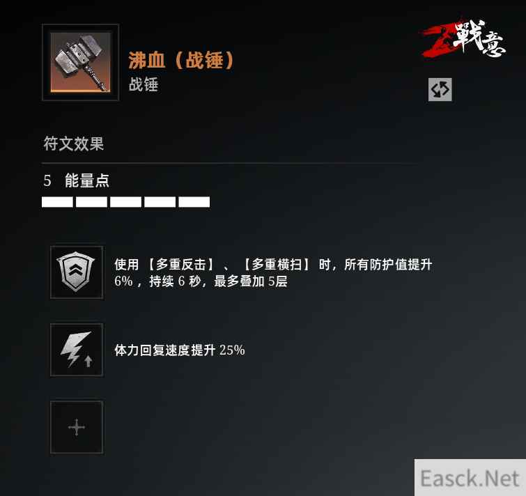 ◈ 装备符文: 帽子:【包扎】持续时间降低40%,总治疗量不变,免爆值提升40点。 衣服:生命值上限提升300点,所有防护值提升10点;坚韧提升5点。 鞋子:【包扎】能够在移动中使用,冷却时间增加15秒;技巧提升5点。 手套:暴击值提升32点,力量提升5点。 推荐技能:备战疾行,蓄力强袭,迅捷锤打,巨力擒抱。备战疾行是大锤的最核心技能,可以通过疾行衔接强袭直接出5连击。强袭适合定点打击。迅捷锤打是大锤唯一一个反手技能。爱的抱抱也是玩大锤武将们最热衷的事情。 更多玩法攻略,请在微信公众号(zhanyi_163)、视频号、微博、贴吧、B站等平台上关注《战意》官方,以便随时获取最新消息。未来将会有更多兵团重回战场!感受古战场的豪情,即刻通过官方网站z.163.com免费下载并畅玩《战意》。 |