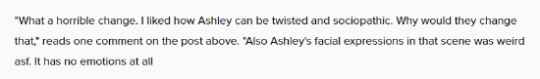 据comicbook消息,很多玩家就游戏角色克里斯被锁在门后死亡的场景展开讨论。玩家普遍指出复刻版游戏与原版存在明显差异,在最新版本中,女角色艾希莉距离门位置很远,当克里斯敲门时,艾希莉会在原地踱步盯着他看了一会儿,然后决定冲过去打开门试图救他。显然,她已经来不及了,然后她开始哭泣。 而在原版中,玩家指出艾希莉并没有表达出同样的悔恨和情感,这反而能体现这个坏女人的阴暗面。但复刻版修改了这样的表达,不少玩家对此提出不满:“真是可怕的变化。我喜欢艾希莉的扭曲和反社会。他们为什么要改变这一点呢?”“我真的很失望,开发商试图让玩家与她感同身受,但让她本该是一个戴着漂亮面具的怪物。”
