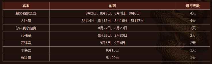 图1:第八届全球争霸赛燃情开赛 【赛程安排】 本届争霸赛将沿用经典的10V10模式,赛程分为服务器预选赛、大区赛和总决赛三个阶段进行,历时两月有余。预选赛报名日期为:8月2日、8月3日、8月4日、8月6日晚18:30-19:30。当日19:30报名期结束时,服务器所有报名战队历史最高装备评分总和前8名的战队,将获得服务器预选赛的参赛资格,并于当日晚20:00参战。荣耀之路就在脚下,谁能一路过关斩将称霸全球,就让我们拭目以待。