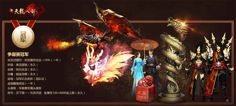 图3:冠军奖励 【全明星阵容】 历届争霸赛中,大神无疑是最耀眼的一群明星。他们的胜利、惜败、恩怨情仇被玩家们津津乐道。众神云集高手过招,究竟谁技压群雄,笑傲苍穹,激动人心的战事即将开场。不屈的坚持,犀利的操作,还是熟悉的身影,点燃着这个盛夏热辣的激情。他们席卷的又何止一场场争霸赛的欢呼赞叹,他们搅动的是整个武林的血色热诚,这里记录了每个人的青春岁月,也见证了新天龙一路的荣耀历程。