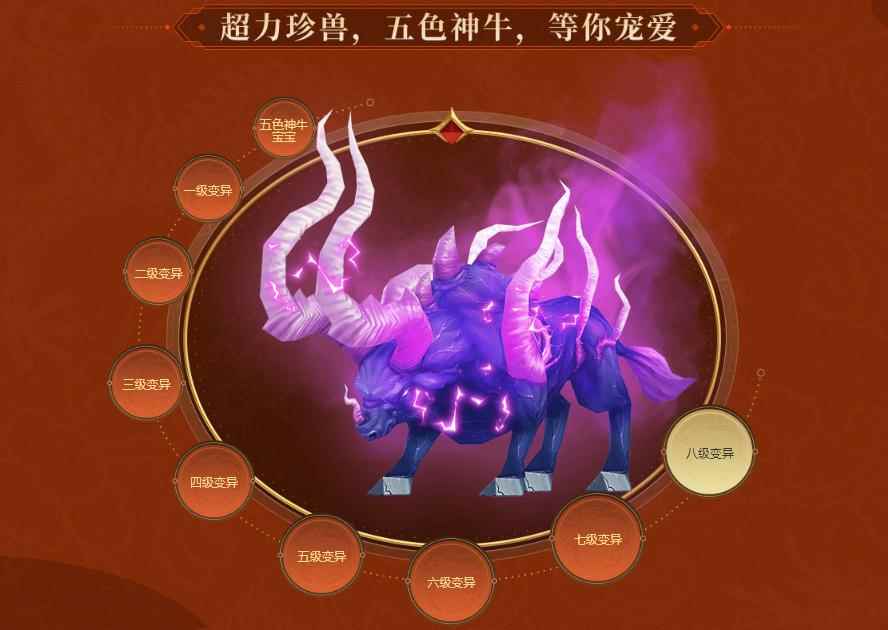 牛年专属限定色 【超级珍兽笼(五色神牛)尊荣登场】 作为实力和地位的象征,超力神兽五色神牛一直是个中佼佼者,顶变深紫闪电漫布通身,低调古朴的造型下隐藏着不容小觑的绝对力量,相信它一定能成为大侠们行走江湖最得力的助力!