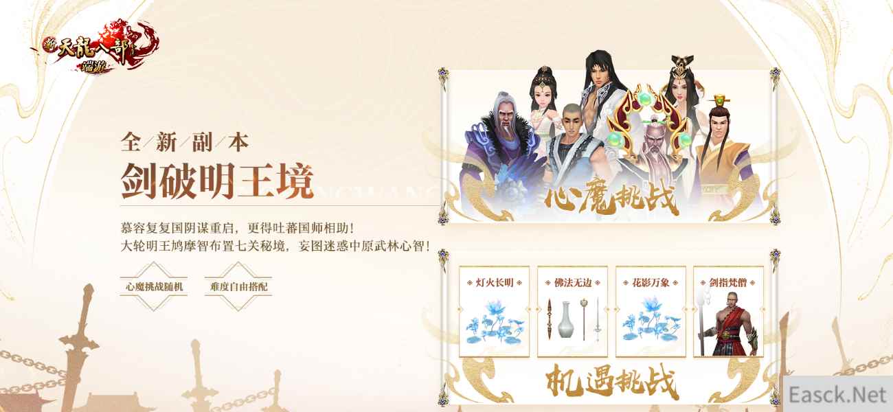 【洛阳危机 慕容世家强势来袭】 慕容复难忘复国执念,唆使鸠摩智再度向中原武林发难。PVE副本【剑破明王境】开启,一众武林人士迷失其中,被迫倒戈。幻境中诡异多变的环境、智慧与武力的层层考验,急需集合众人之力,挽救迷失之人。