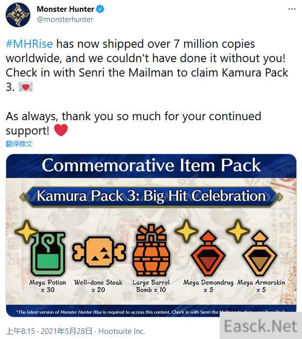 今日(5月28日),卡普空官方宣布《怪物猎人:崛起》全球销量已经突破700万,为了庆贺这一新的里程碑,官方又追加了道具包,感谢玩家们的支持。