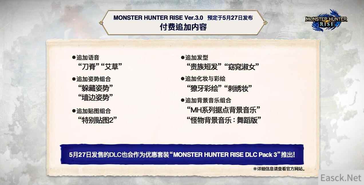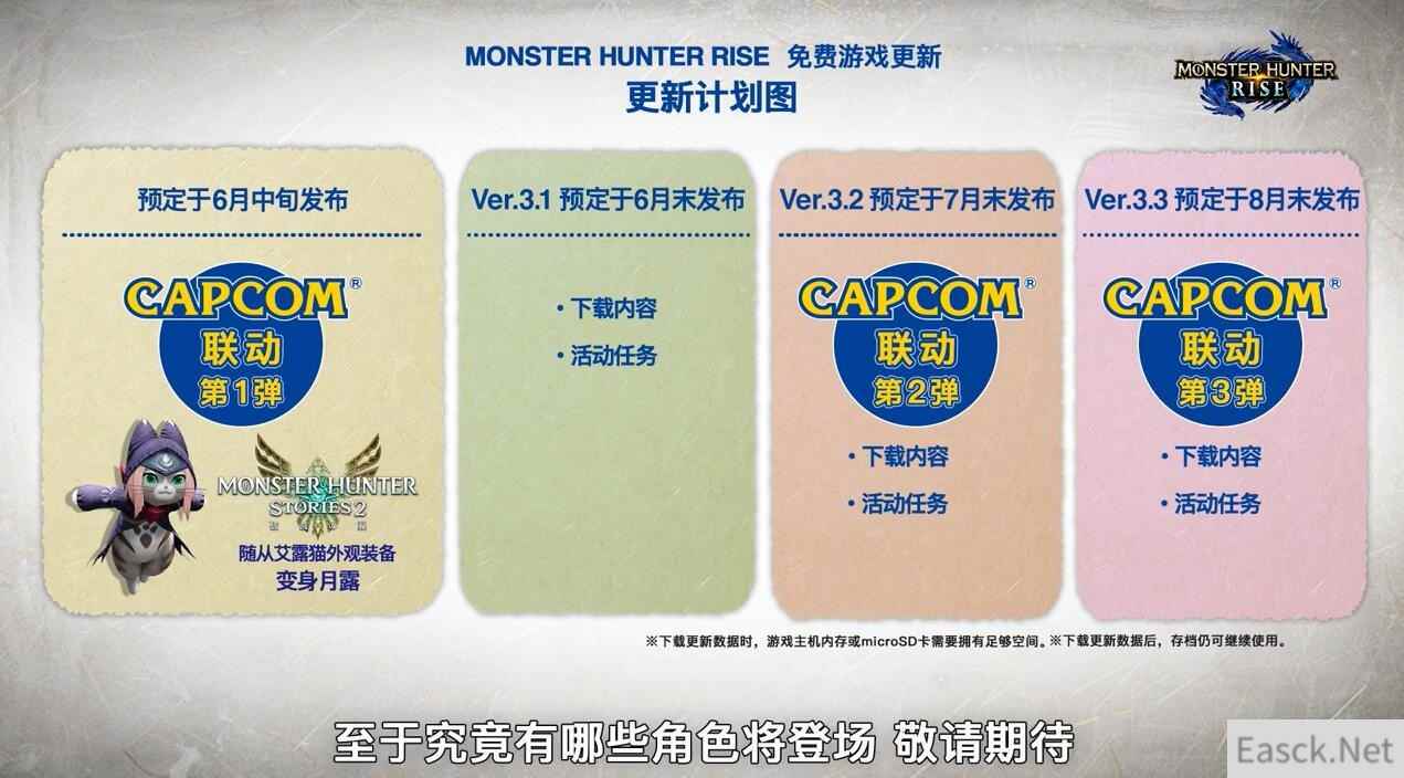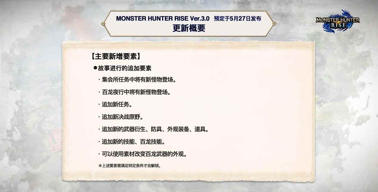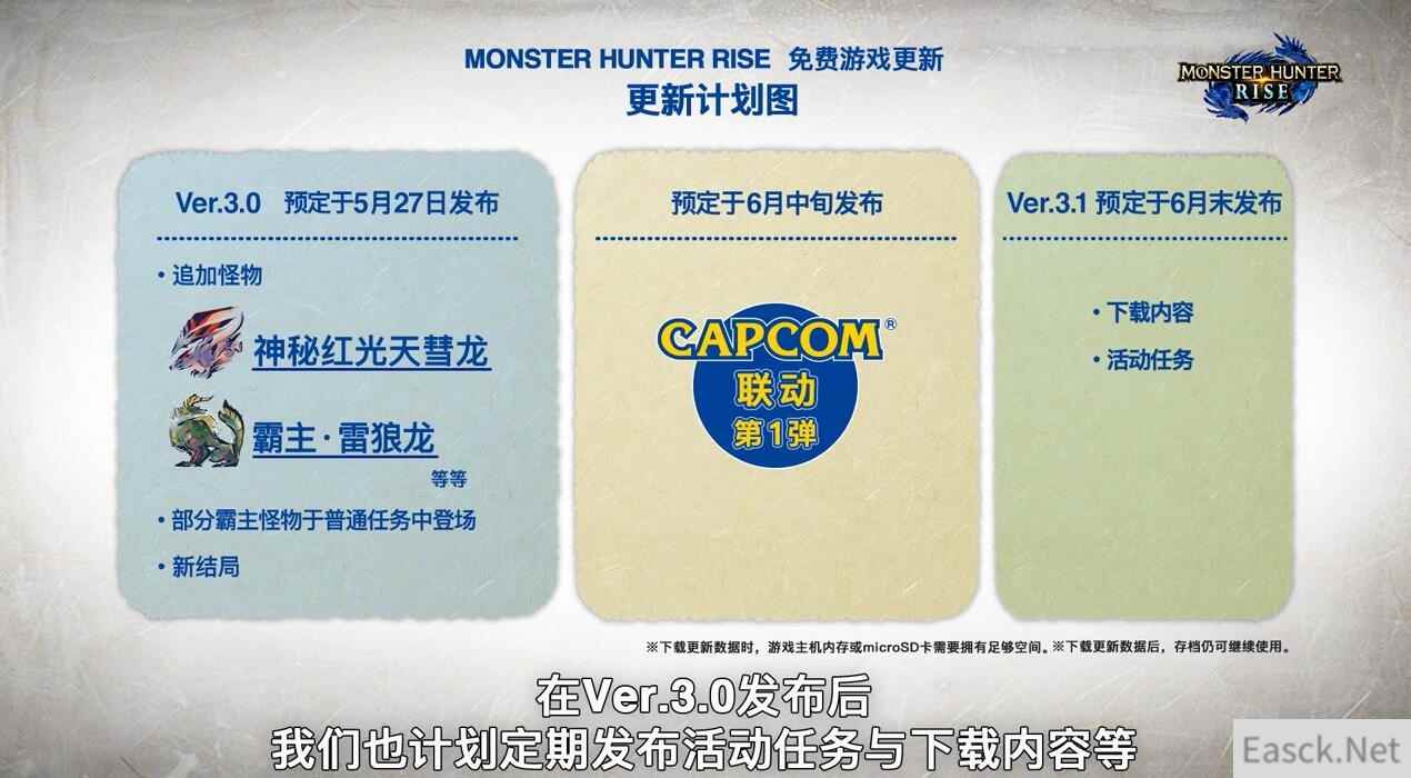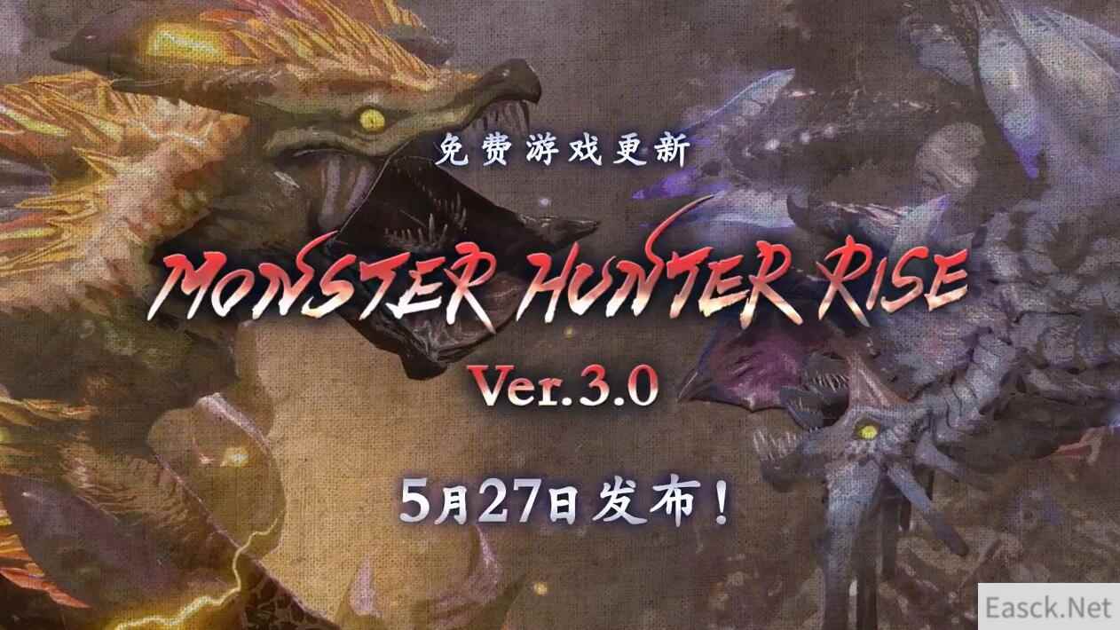 之后是《怪物猎人:崛起》3.0的信息。3.0版更新将于5月27日周四推出。游戏将随着更新加入神秘红光天彗龙(《怪物猎人XX》封面怪物天彗龙的特殊个体)与霸主雷狼龙等怪物。另外本作游戏结局和剧情高峰也将随着3.0版本更新加入。卡普空还将在今后定期为游戏推出免费更新,6月份将举行各种联动活动,首次活动预计于6月中旬进行,可获得破灭之翼中的艾露猫外观装束。