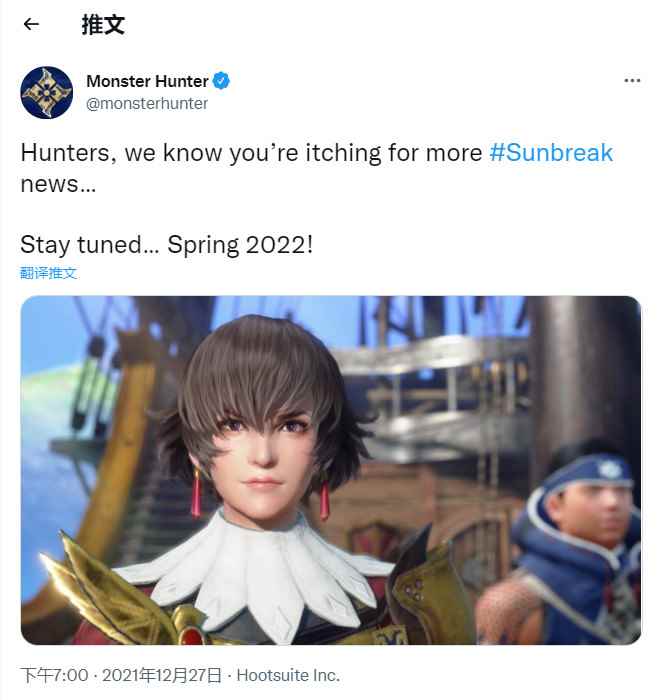 《怪物猎人》官推宣布,《怪物猎人崛起:曙光》资料片将在2022年春季公开更多消息,敬请期待。